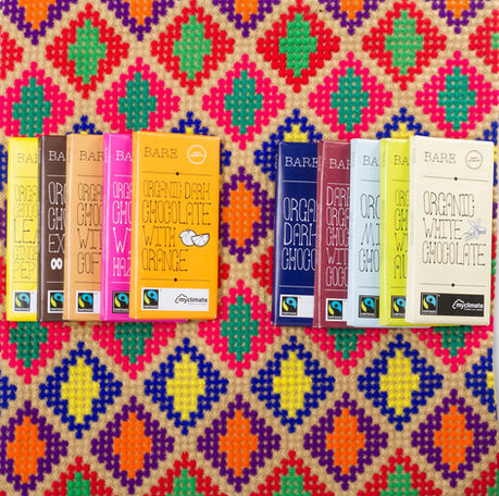 The name "Bare" was created to communicate the brand's clean, honest and ethical positioning and a hand-drawn logo with bold bright colors ensured a cheeky, light-hearted tone, making this chocolate brand very warm, approachable and friendly.